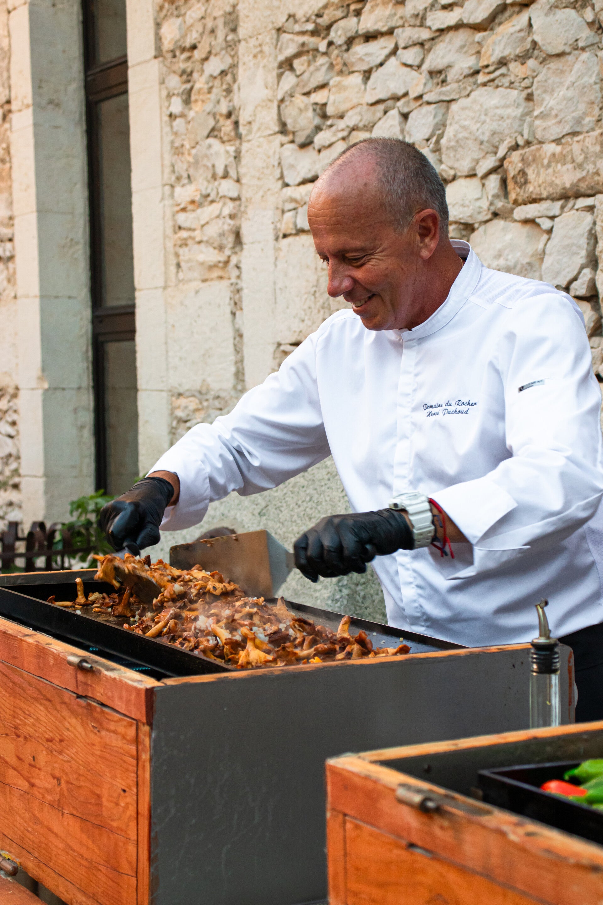 Notre chef passionné cuisine sur place, offrant une expérience culinaire authentique avec des planchas et des démonstrations en direct. Nos équipes de salle, fortes de leur expérience et de leur connaissance du DOMAINE DU ROCHER, garantissent un service impeccable.